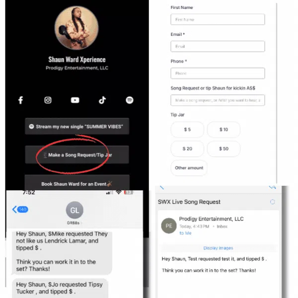 Create a Song Request / Shoutout / Tip Jar link and form (accept live song requests at your events, etc. sent directly to you via text and/or email.)
